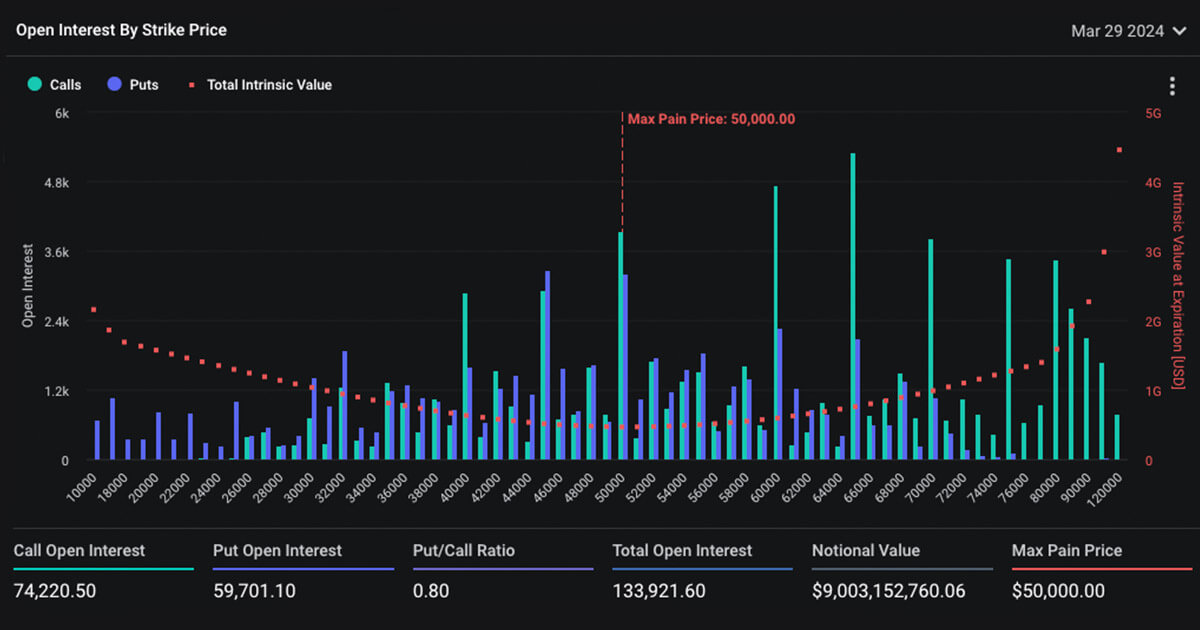 Deribit data indicates that nearly $9 billion worth of Bitcoin (BTC) options are due to expire on March 29, the last Friday of the month, with the total open interest amounting to 133,914 BTC. The put/call ratio is reported at 0.80, signifying more calls in circulation compared to puts, and reflects bullish market sentiment — for every 100 calls, there are 80 puts. Call open interest stands at 74,213 BTC, outstripping put open interest, which totals 59,701 BTC.