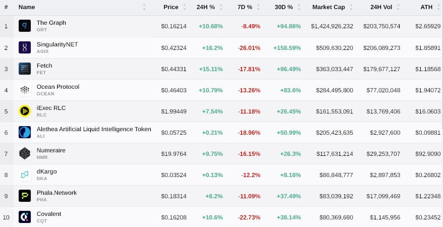 Data stream aggregator The Graph leads the sector with a market cap of $1.42 billion, while SingularityNET saw the most substantial gains, up 16.2% in 24 hours.
