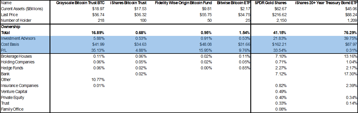 Data from Citibank, shared by Bianco, shows that Investment Advisors account for about 35% of all ETFs. However, they hold less than 1% of the new spot Bitcoin ETFs like BlackRock’s IBIT, Fidelity’s FBTC, and Bitwise’s BITB.