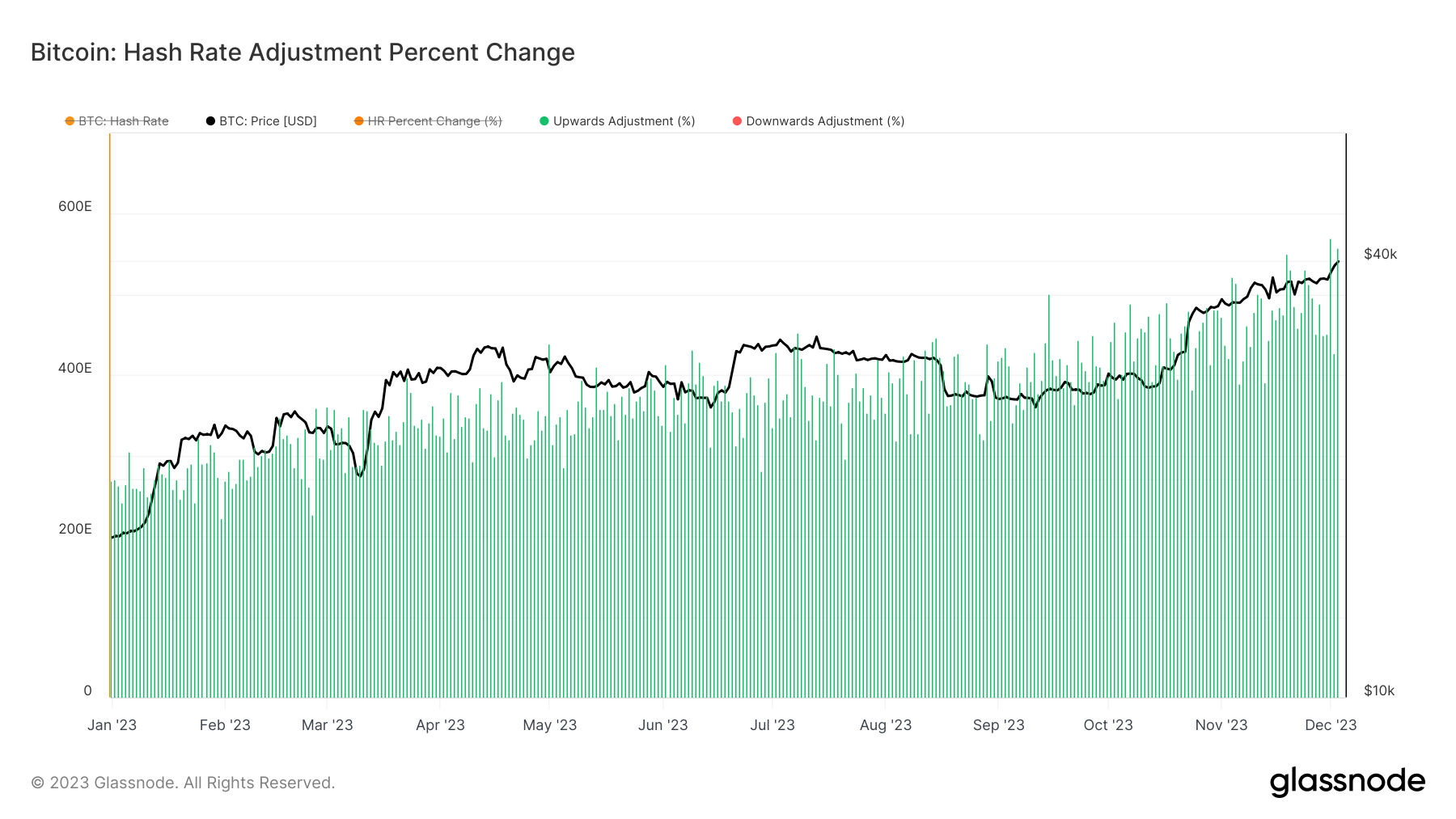 Amid this surge, the Bitcoin network is less than a week from its next difficulty adjustment. This adjustment, currently in the positive territory by just over 1%, is poised to be the seventh consecutive positive adjustment. This sequence of positive adjustments mirrors a similar trend observed after the China mining ban in Summer 2021, which led to a steep % drop in the hash rate by 50%.