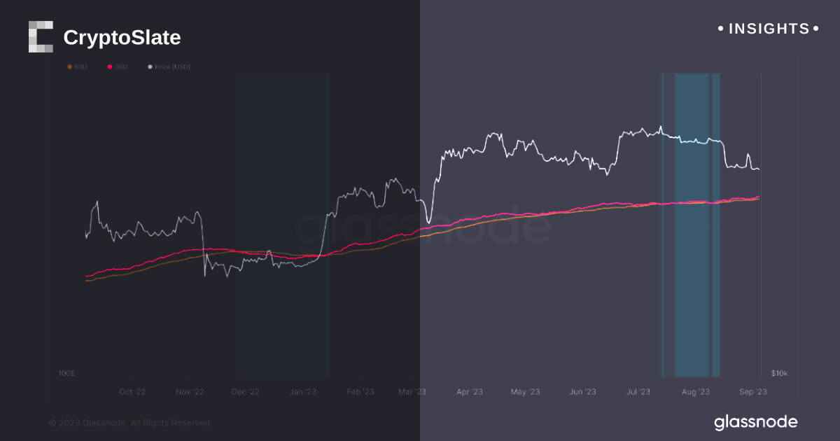 The recent downturn in Bitcoin can be seen in the fluctuations witnessed in the miner balance. Last week, the Bitcoin hash rate saw a 5% drop from its peak value of 400 eh/s. This was concurrent with an anticipated decline of around 3.5% in the difficulty adjustment, a measure of how hard it is to mine a new block for the Bitcoin blockchain.