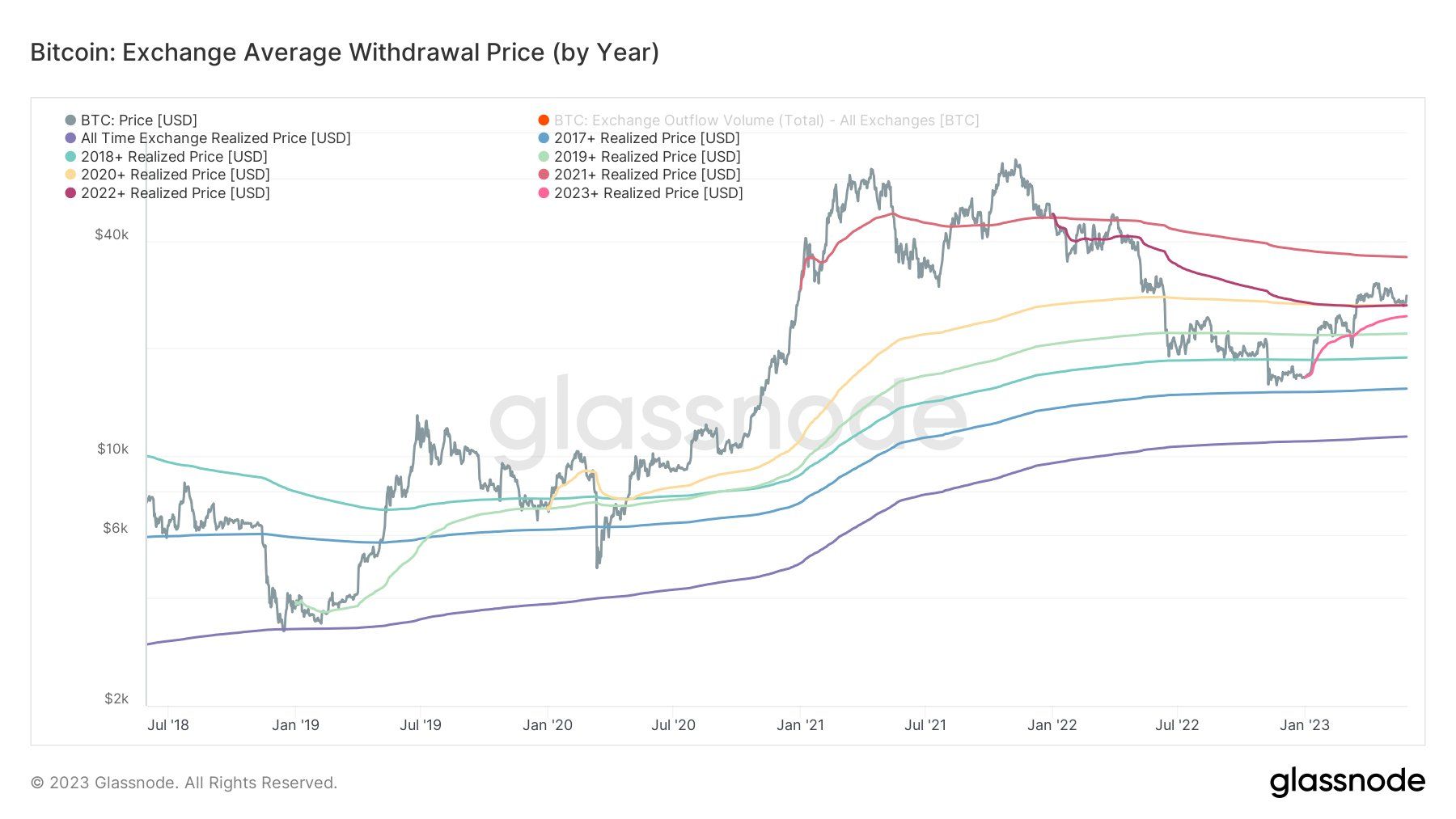 - Since March 2023, Bitcoin’s realized price has hovered around the 2020 and 2022 levels, of roughly $26,400.