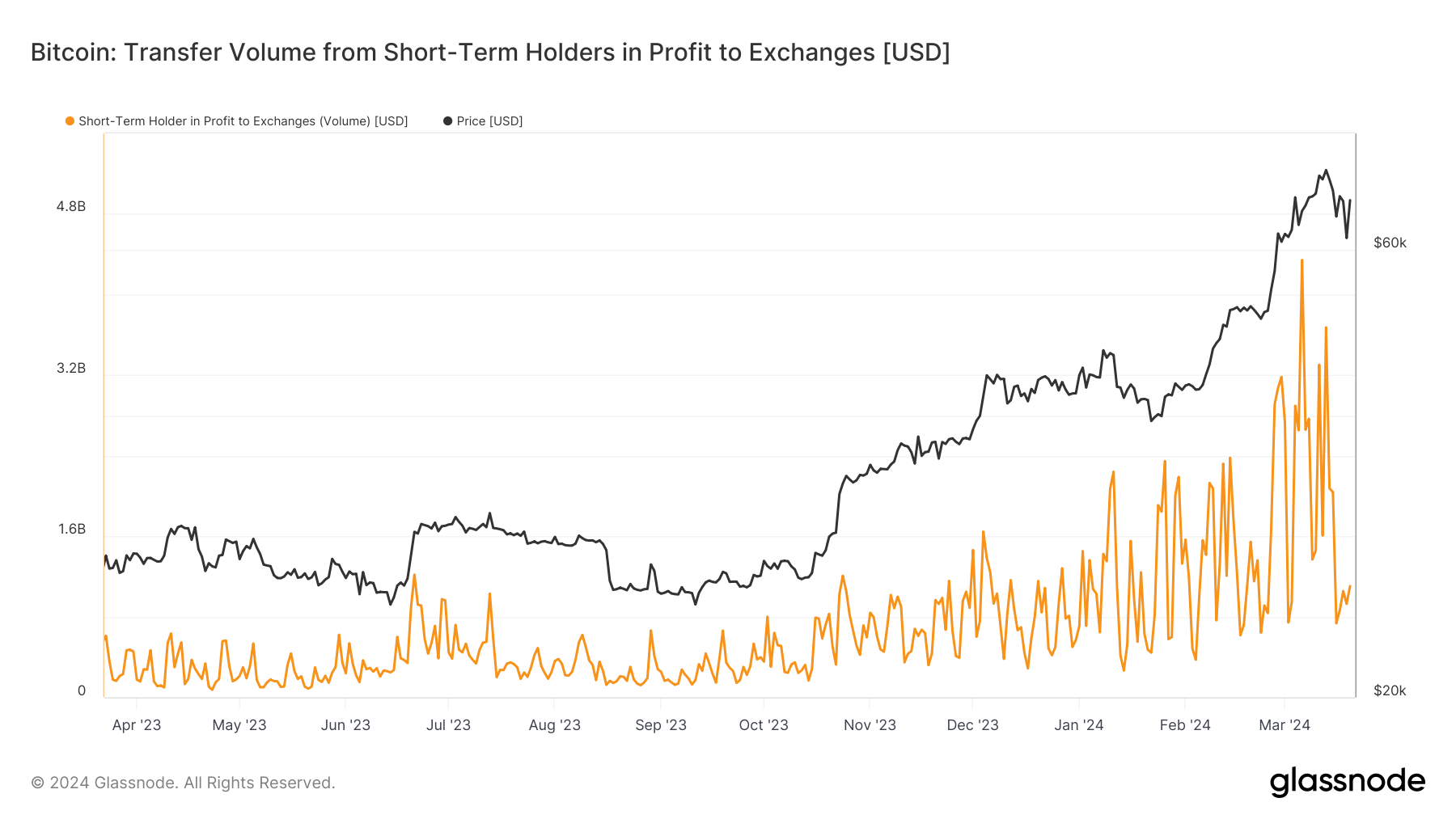 Despite these losses, there is a silver lining. Since Bitcoin’s all-time high on March 14, short-term holders have considerably reduced profit-taking to exchanges, indicative of their dissatisfaction with Bitcoin’s current price range and potential anticipation of higher valuations for profitable exits.