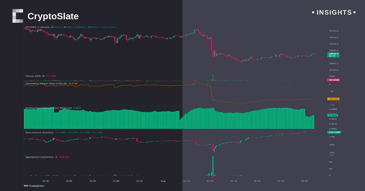 During the early hours of the morning on Aug. 1, open interest in Bitcoin increased on Binance, moving from 106,000 Bitcoin to 111,000 Bitcoin, a change of roughly $145 million. Subsequently, funding rates began to drop, triggering liquidations alongside.
