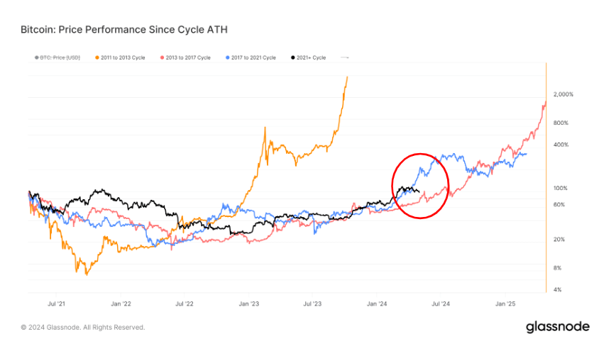 Glassnode data indicates that Bitcoin is presently down by 12% from its 2021 peak, established in April 2021. This positions it between the trajectories of the two preceding cycles at this stage.