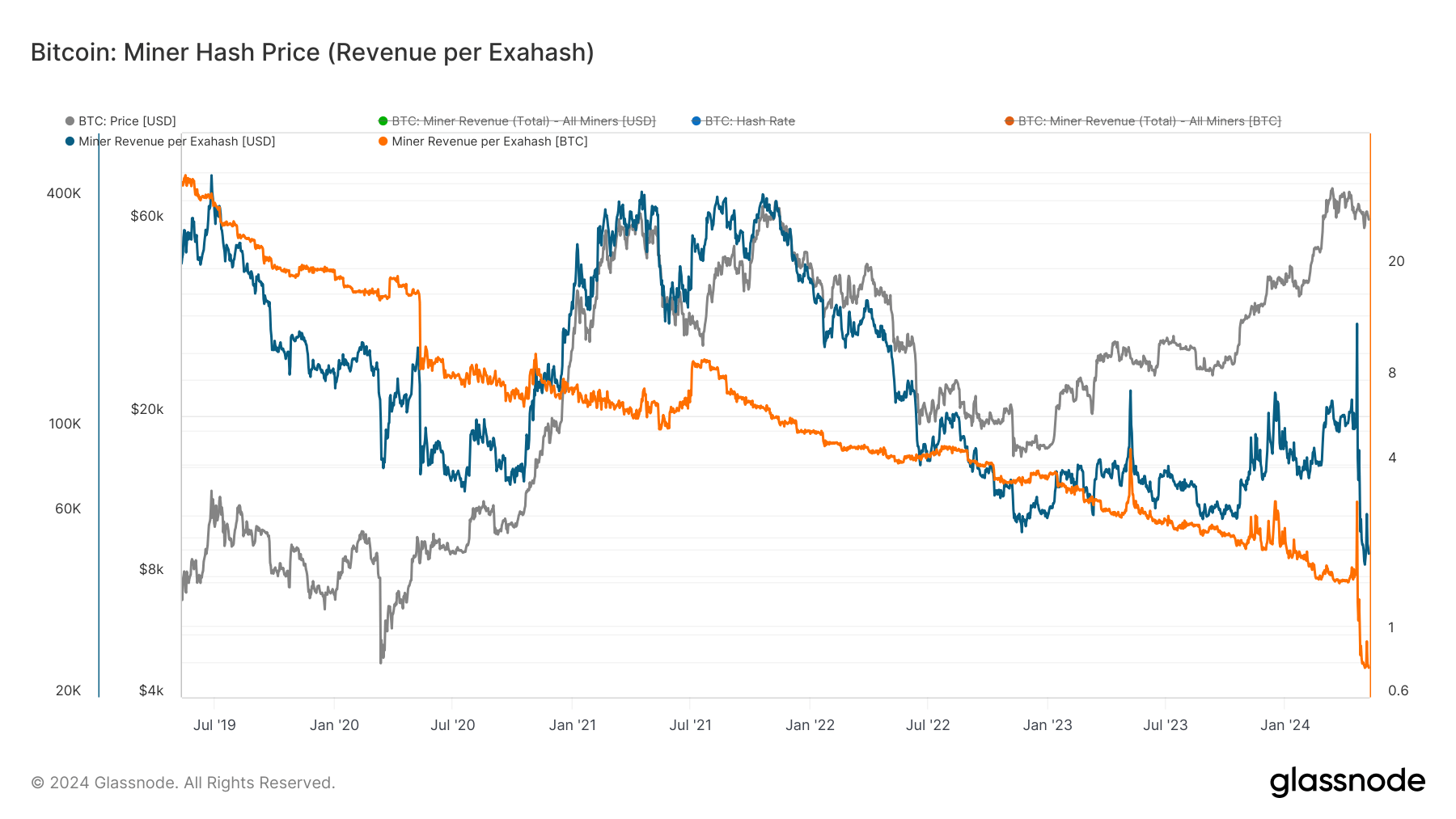 Miner Hash Price (Revenue Per Exahash): (Source: Glassnode)