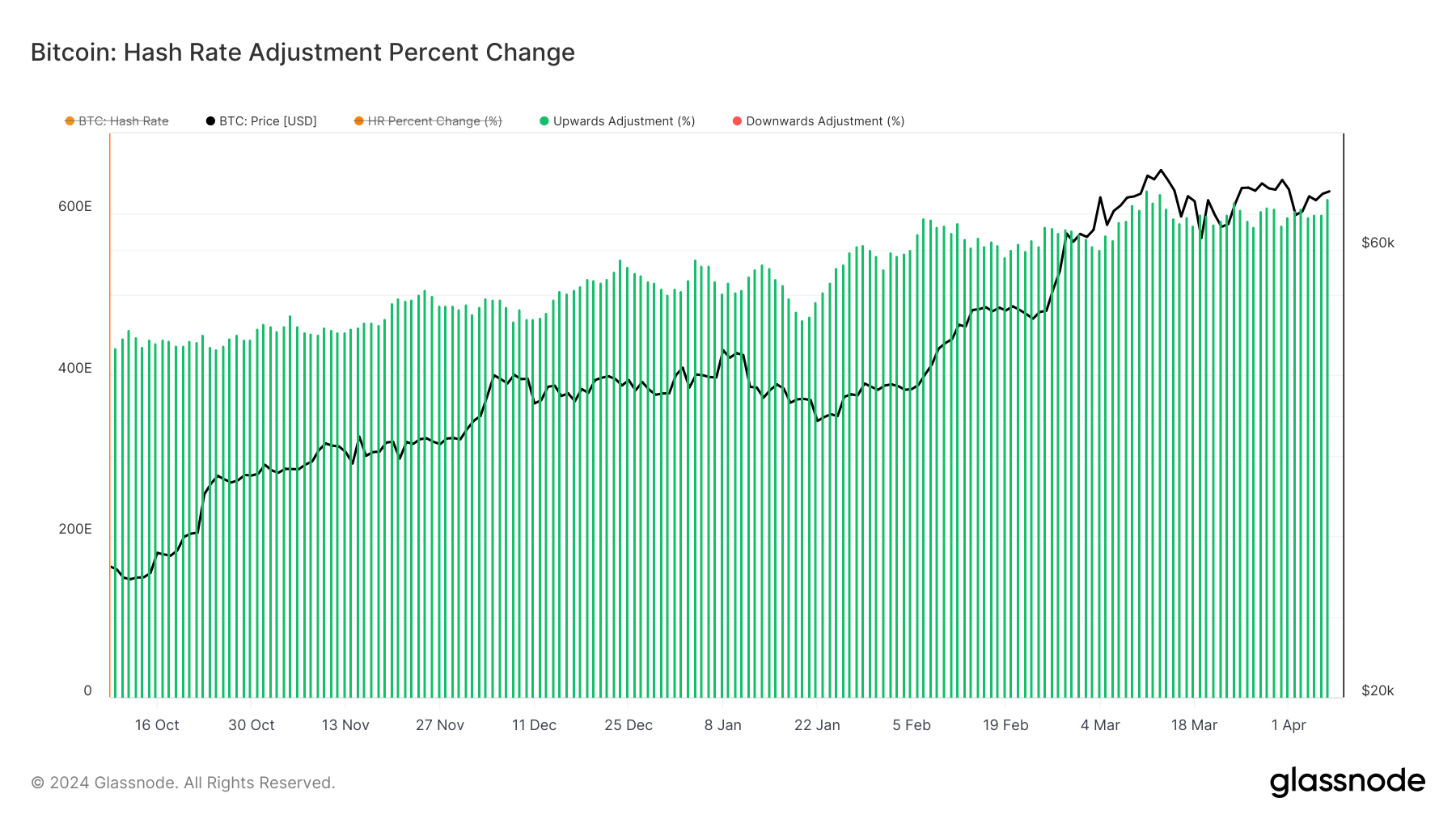 Notably, the upcoming difficulty adjustment, scheduled for Apr. 10, is projected to exceed 3%, according to Newhedge, further reflecting the growing computational power securing the network. This adjustment is particularly significant as it precedes the much-anticipated Bitcoin halving event scheduled for Apr. 20, where the block reward for miners will be reduced by 50%.