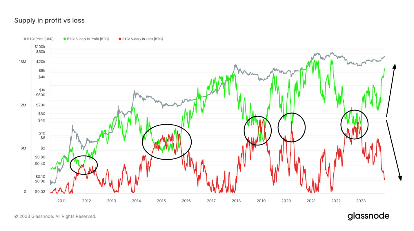 Analyzing the supply dynamics of Bitcoin reveals a telling story of profit and loss convergence, a significant indicator of market fluctuations. Of the approximately 19.3 million Bitcoin in circulation, an estimated 17.3 million are in profit, leaving 1.9 million at a loss. The convergence of supply in profit and loss – where losses supersede profits – serves as a marker for the bottom in Bitcoin cycles. This phenomenon has been observed recurrently during bear markets, particularly in 2015, 2019, 2020, 2021, and 2022.