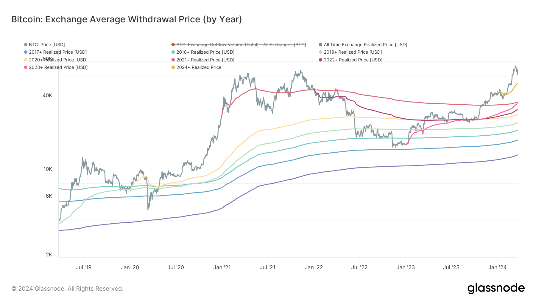 Utilizing data from Glassnode to estimate a market-wide cost basis reveals intriguing trends in the average price at which coins are withdrawn from exchanges. The information, segregated into cohorts, uncovers an upward trajectory on a cost basis, indicating a trend of purchasing Bitcoin at incrementally higher prices.