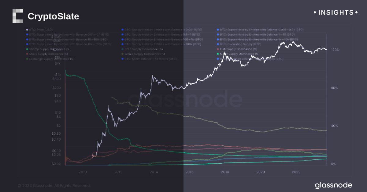 From March 2020 to September 2023, the landscape of Bitcoin entity balance dominance witnessed a notable shift. The ‘shrimp’ class, entities holding less than 1 Bitcoin, saw their dominance rise from 3.5% to 6.9%, indicating a growing number of small-scale investors. Similarly, ‘crab’ entities holding 1-10 Bitcoins surged from 8.2% to 10.9%, reinforcing this trend.