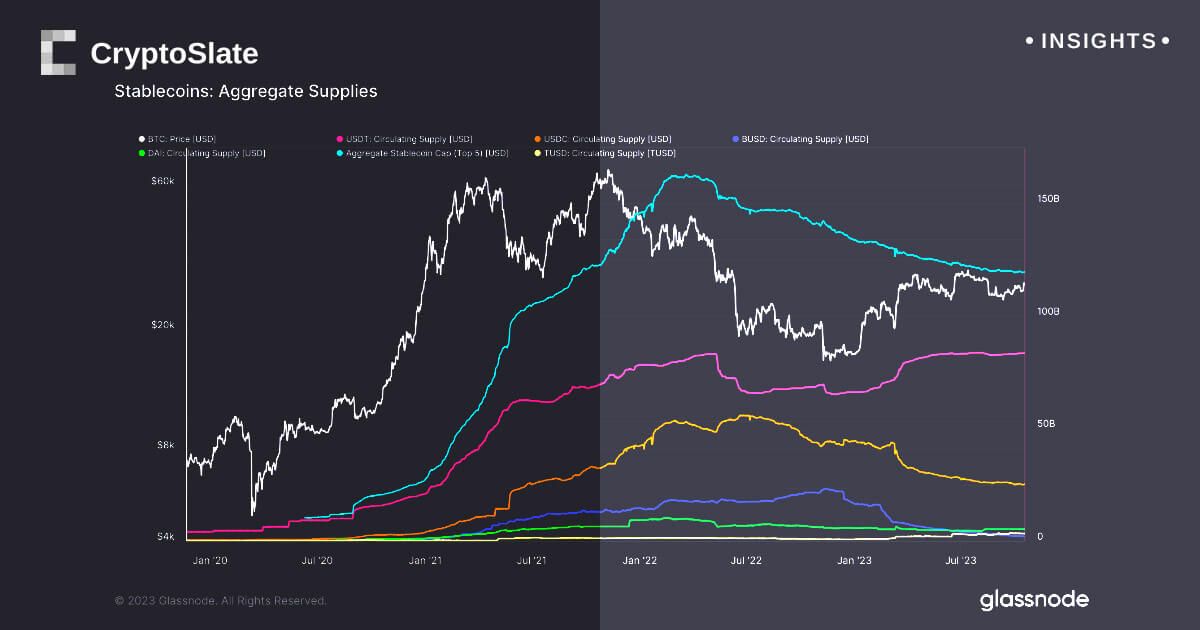 Tether (USDT) leads the pack with a circulating supply of $83.5 billion, accounting for about 70% of the stablecoin market. Interestingly, this dominance has been on an upward trajectory, while the influence of USDC witnessed a decline from 38% to 21% within 16 months.